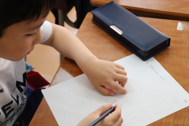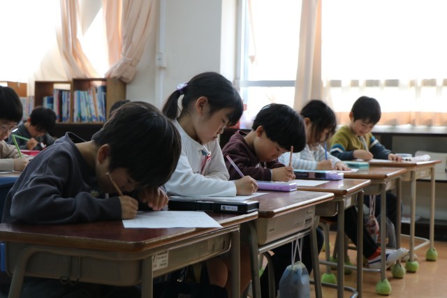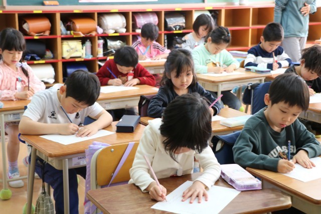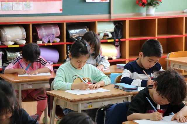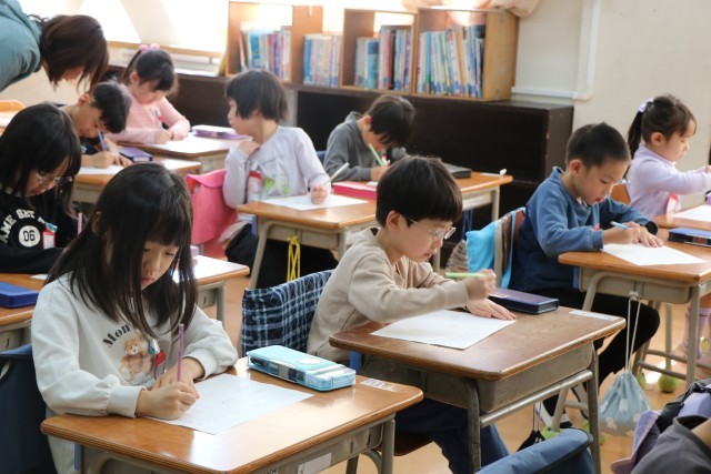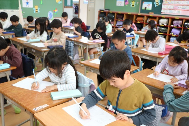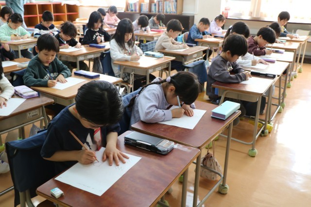 1年生の様子です。自分たちに関係のる教室を見に、学校の中を探検しています。静かに静かに・・・授業中なのでおしゃべりをしないで静かに歩くこともっちゃーんとできる1年生です。そして鉛筆のもち方や運筆練習も頑張っています。ずっと座って学習することばかりでなく、楽しく活動するとき、集中して学習するときなど、先生たちは45分を様々な内容で工夫して学習に向かえるようにしています。