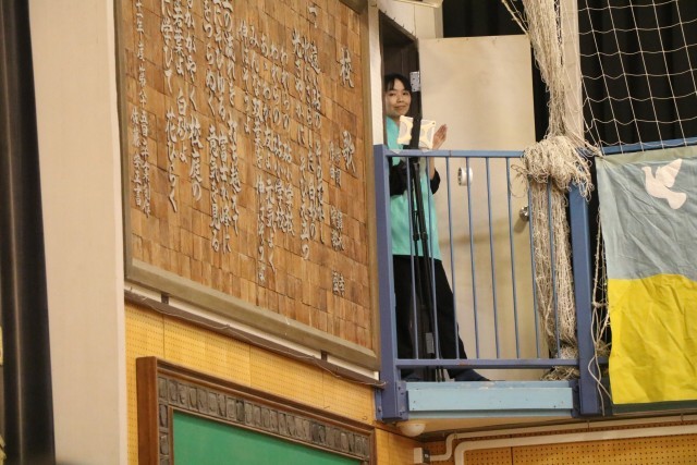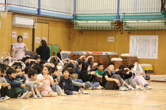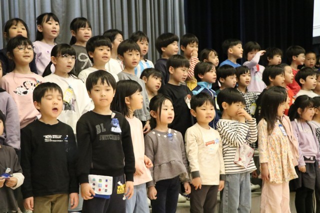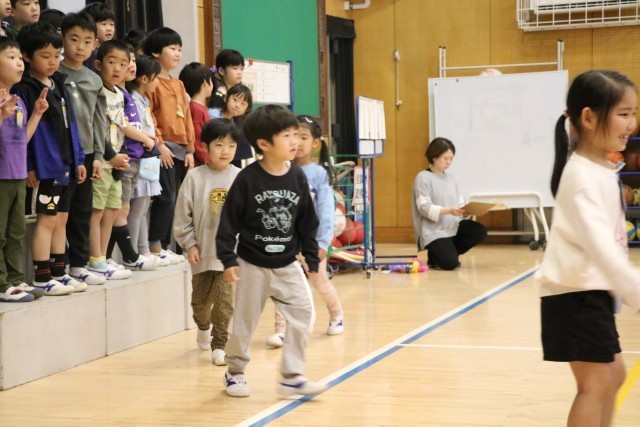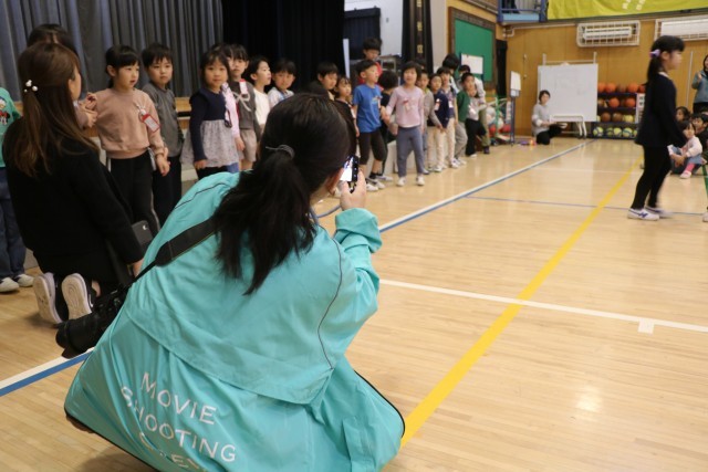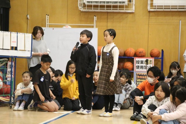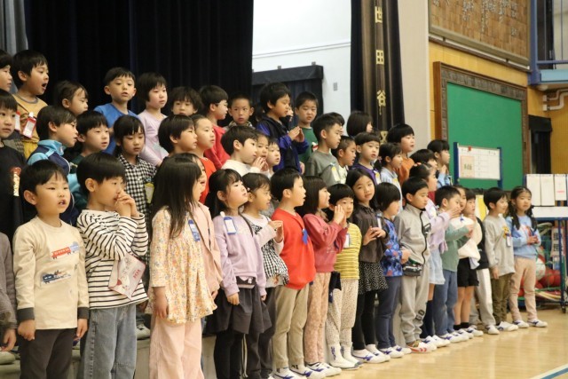 〇×クイズの後は、1年生からの言葉と歌の披露です。「1年生になったら」ならぬ「1年生になったので」の歌を元気よく歌いました。グリーンのジャンバーを着た方は、動画配信部改めスクールメディアクルーの方です。いろいろな角度から今日の集会の様子を動画撮影し、砧小学校限定bandにアップします。楽しみにしていてください。