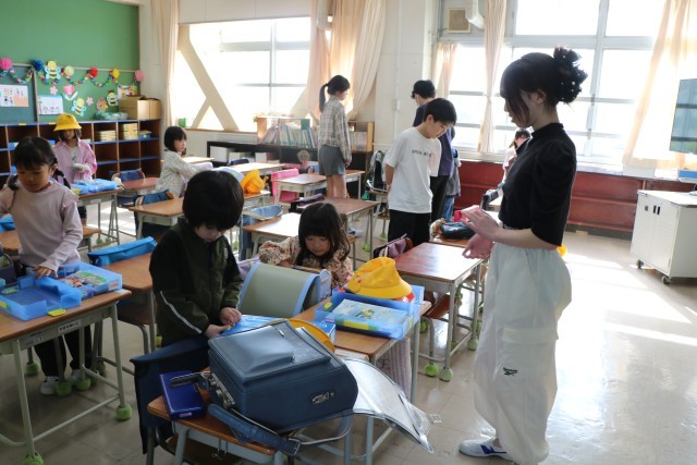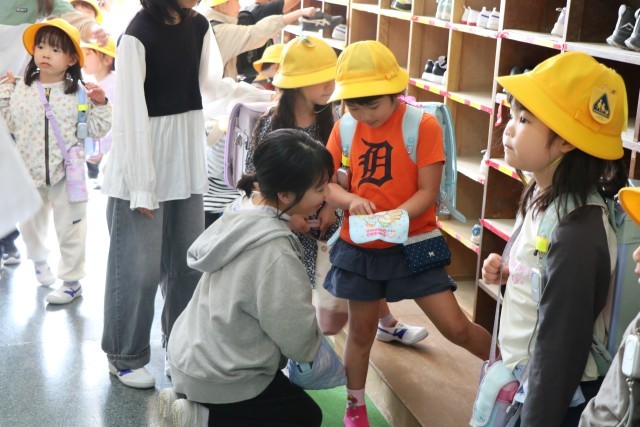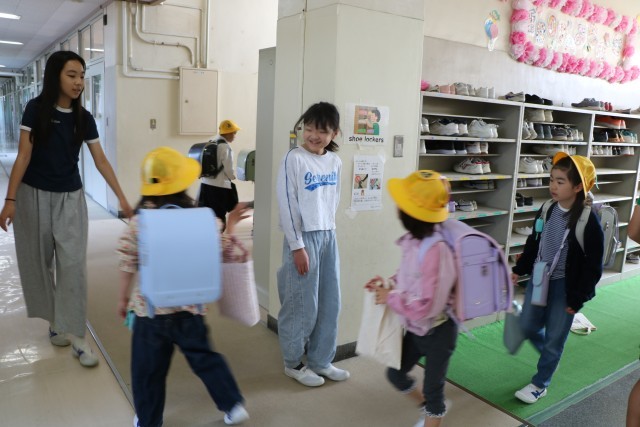 1年生の昇降口や教室では、今朝も6年生が大活躍しています。しかし1年生もだいぶ朝の支度がわかってきて、一人でできることが増えました。6年生はそんな1年生のことを理解し、手を差し伸べるだけでなく、目で見ていてあげる、本当に困ったり違うことをしていると声をかける・・・そんな姿勢に変わってきました。1年生が一人でできるようになることが目的の6年生のお手伝いです。