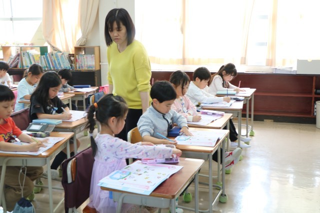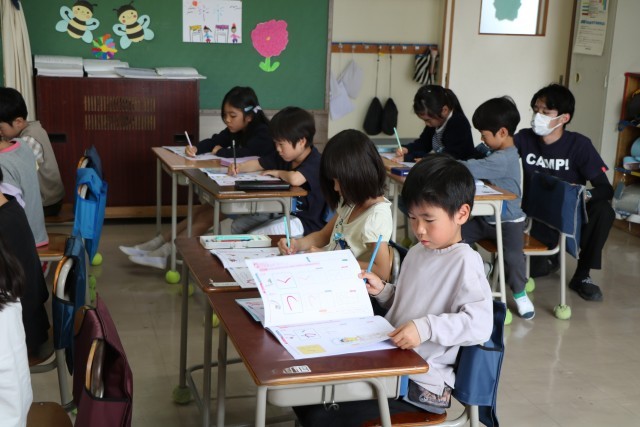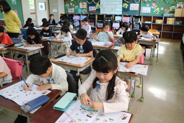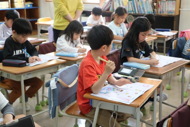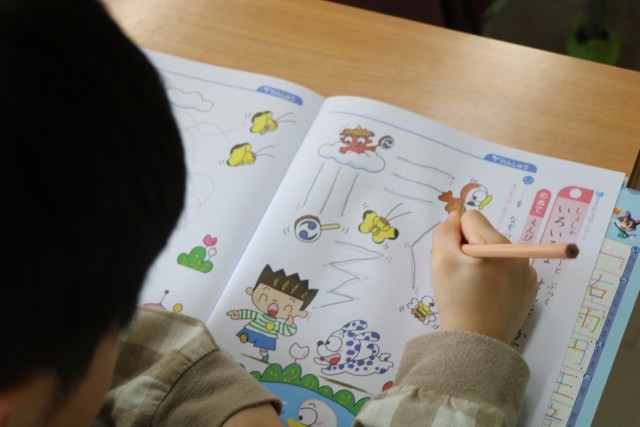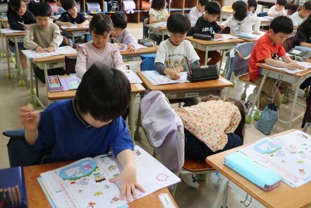 1年生書写の様子です。鉛筆を正しく持って色々な線をなぞります。この後、すてきな作品ができましたが、それはいずれ掲示しますので、お楽しみに。こちらではご紹介しないことにします。