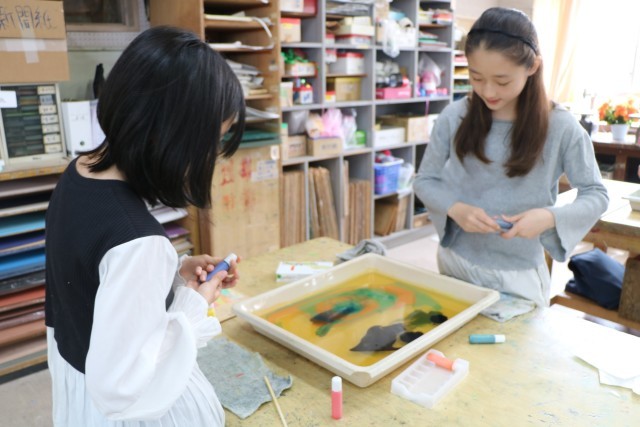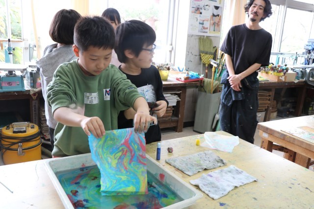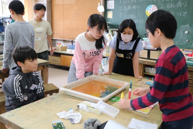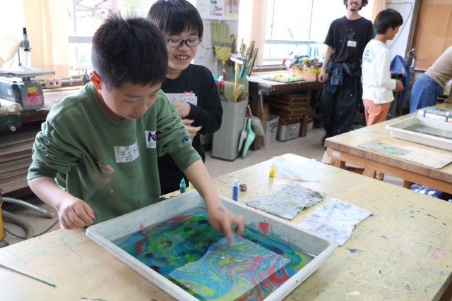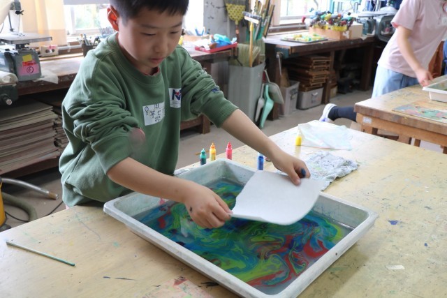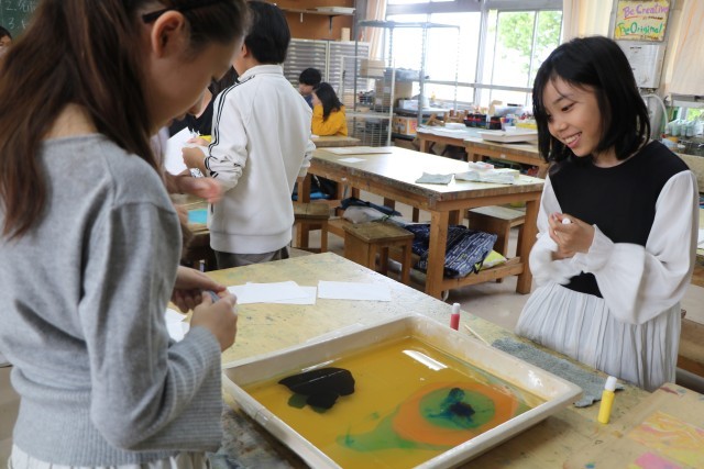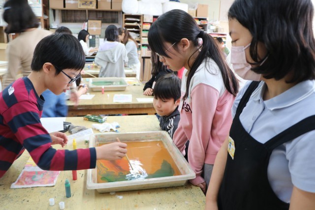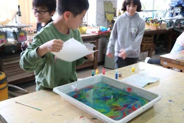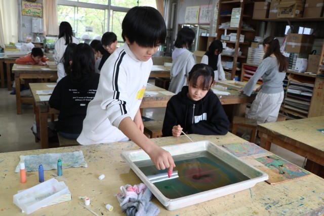 6年生図工の様子です。一人ずつ水を張ったバットにマーブリング染液をたらし紙を染めます。垂らした染液を割りばしなどで動かし模様になったり色が交じり合ったりしたら素早く紙を浮かせます。どの模様を写し取ろうか?紙を置く場所によって作品の出来上がりが違ってきて楽しいのです。