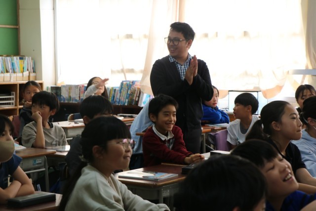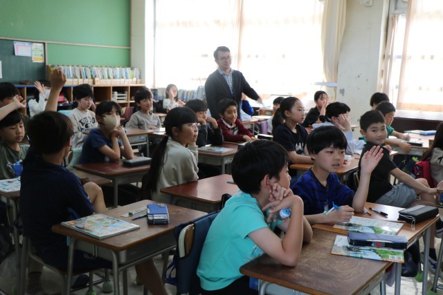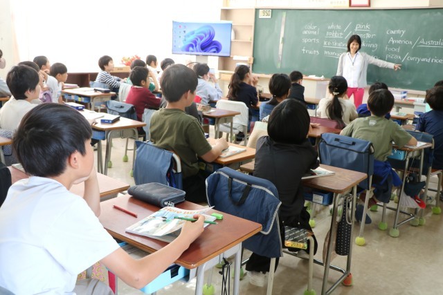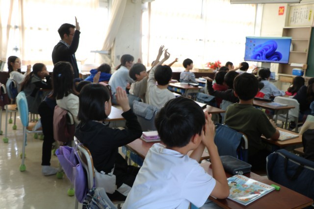 5年生「外国語」の学習の様子です。5・6年生は「外国語活動」ではありません。外国語(英語)は教科となり、年間70時間の授業で「聞く・話す」に加え「読む・書く」が本格化します。文法や約600~700語の語彙を学び、中学校英語へのスムーズな橋渡しや、実際のコミュニケーション能力を育てる基盤となります。5年生は楽しく、でもしっかり学んでいます。
