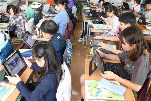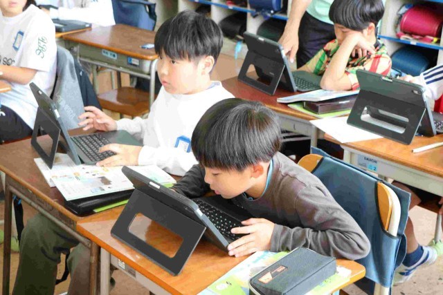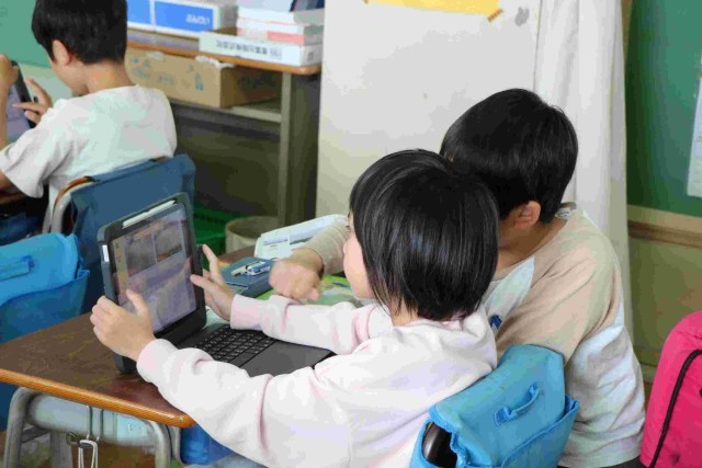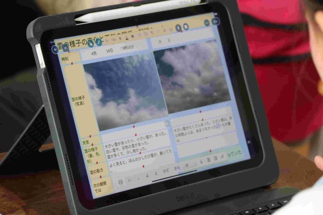 空の写真を見て、雲の様子や動きについて分かったことを気付いたことをタブレットにメモし、次の観察の時に空の様子はどうなっているかも予想しました。細かい様子もよく気付いてメモできていましたし、その後のよそうも発想豊かでした。学習していくのが楽しみになりますね。