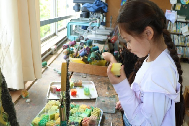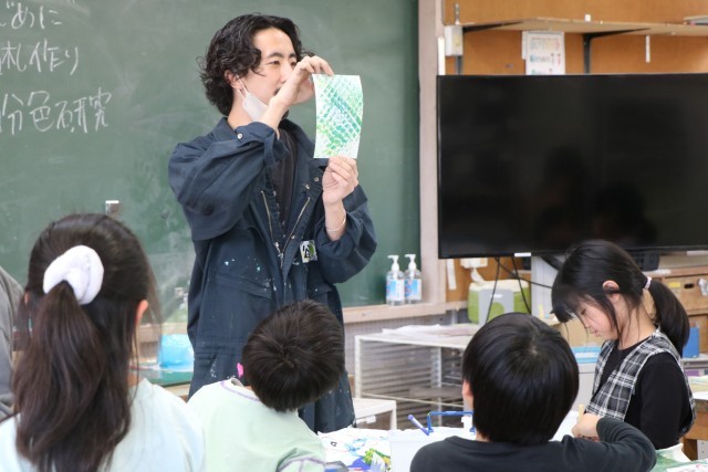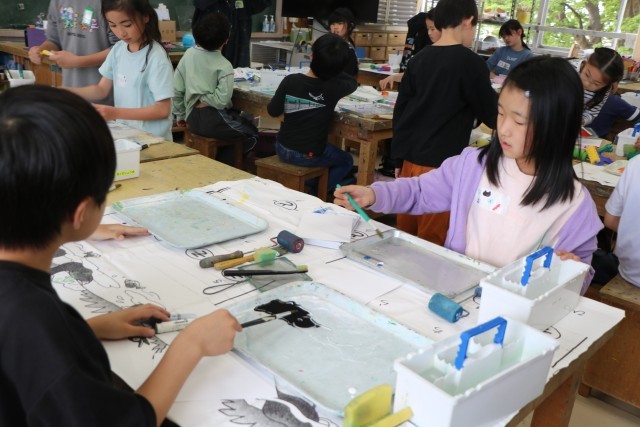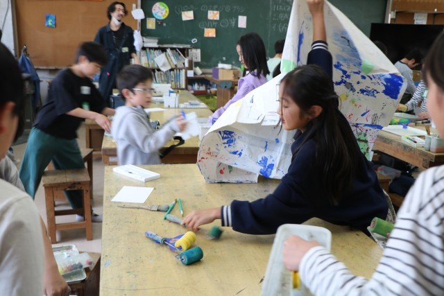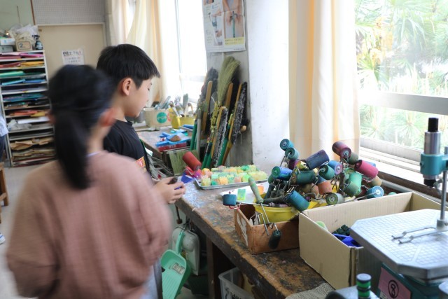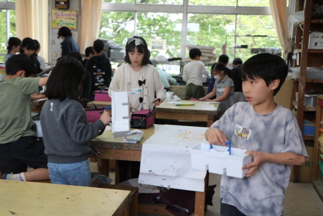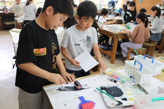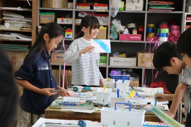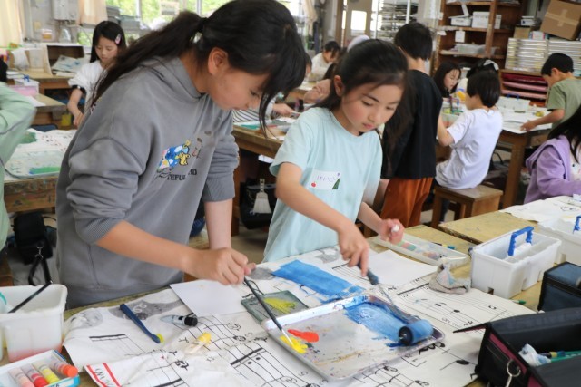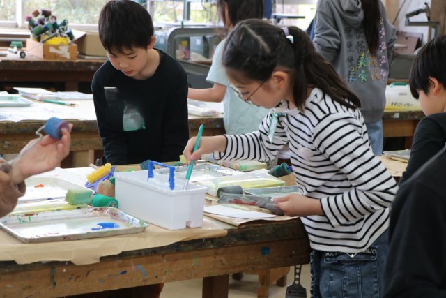名札ができたら、次は『自分の色研究者』に変身です。様々な道具の使い方を先生に教えてもらったら、好きな絵の具の色を出して試してみます。机に敷く汚れ防止の紙を広げ、絵の具の準備をしてさっそく研究スタートです。
