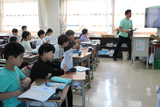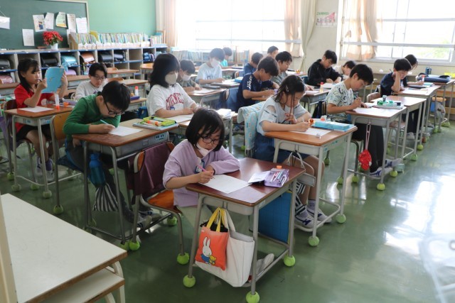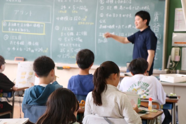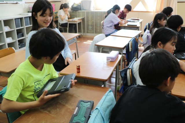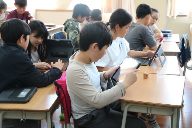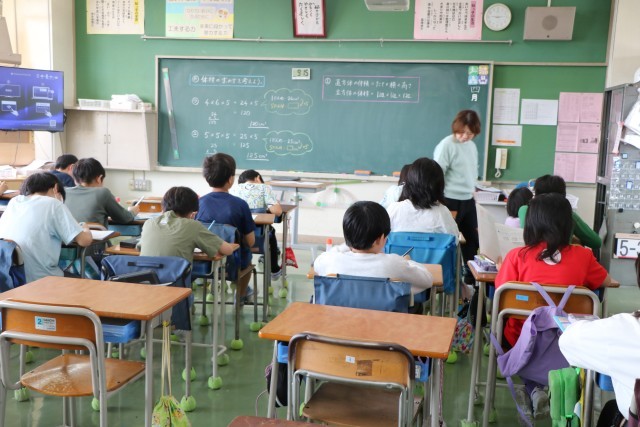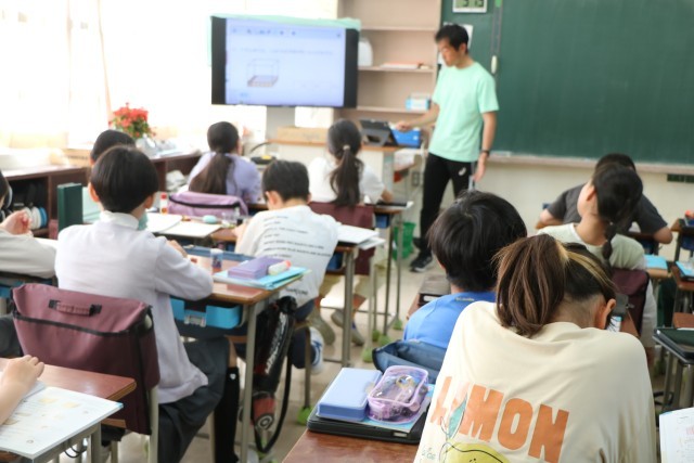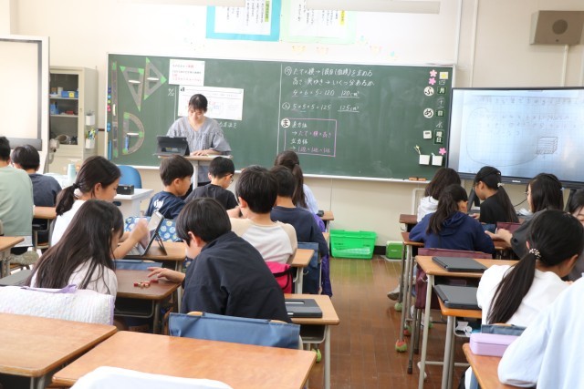 5年生算数の様子です。砧小学校では、3年生以上は算数少人数指導を実施しています。3クラスを4つに分けるので、ものすごく少人数ではありませんが、教室の人数よりは少人数で、先生にじっくり教わることができるのです。具体物を操作しながら、立体の体積の求め方を考えていました。