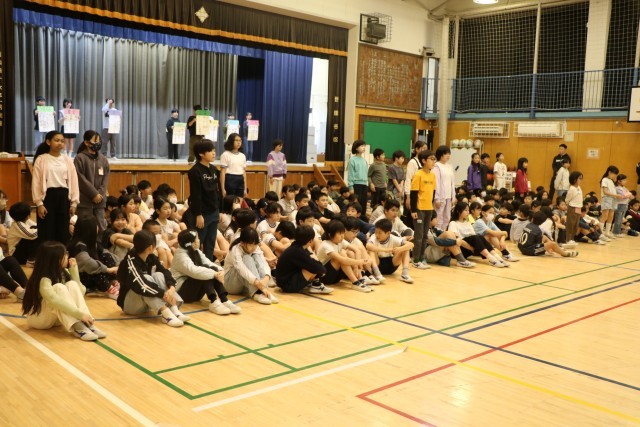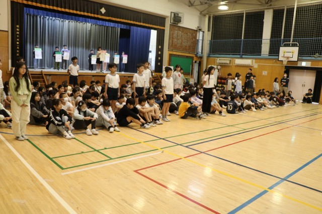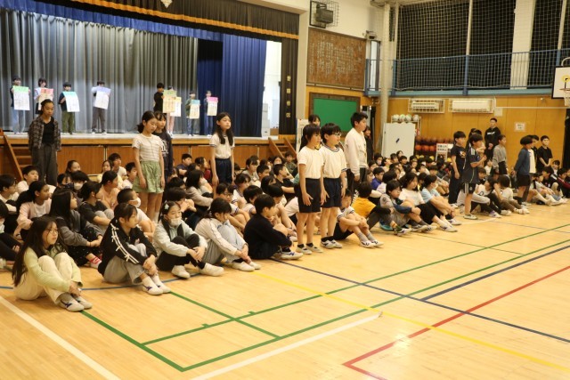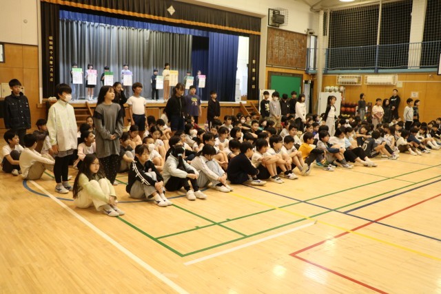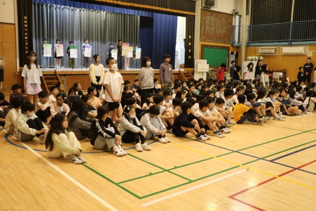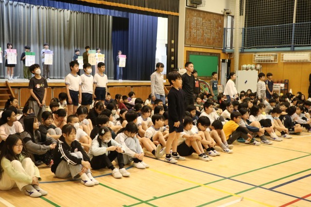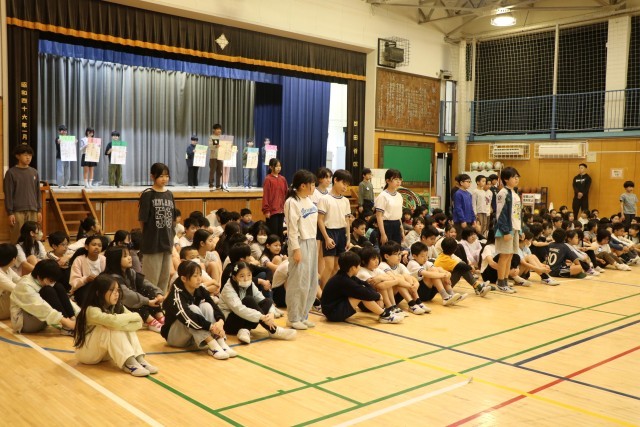 金曜日の朝は集会・朝会の日です。今日は委員長紹介集会です。放送、集会、図書、美化、運動、保健給食、栽培、代表お8つの委員会の委員長が委員期の目標を発表し、委員のメンバーが立ちました。