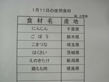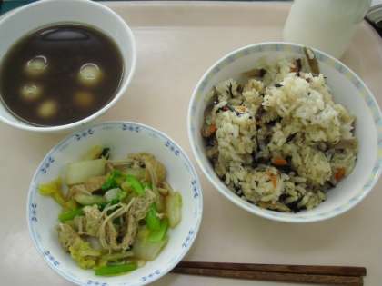 1月11日(金)今日の給食 ひじきご飯 きのこ入り煮浸し 白玉しるこ 牛乳
