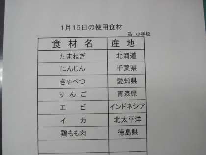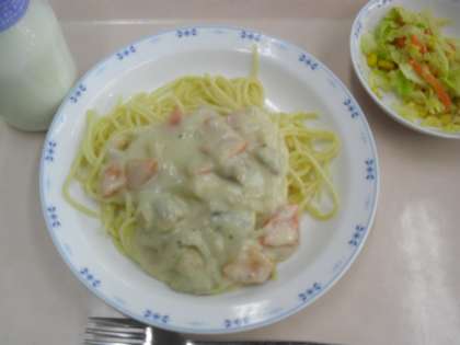 1月16日(水)今日の給食 スパゲッティクリームソース フレンチみかんサラダ 牛乳