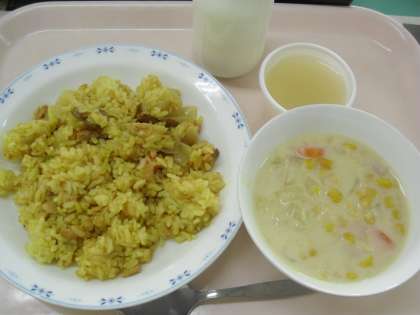 2月4日(月)今日の給食 ツナピラフ クリームスープ リンゴゼリー 牛乳