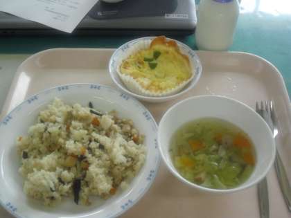 山菜ピラフ   牛乳   キャベツスープ   春色キッシュ
