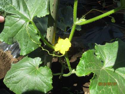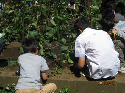 5月11日に植えたきゅうりの小さな苗がスクスク育ち、花が咲きました。「2週間ほどでこんなに大きく育つんだ」と、みんなでびっくりしながら観察しました。