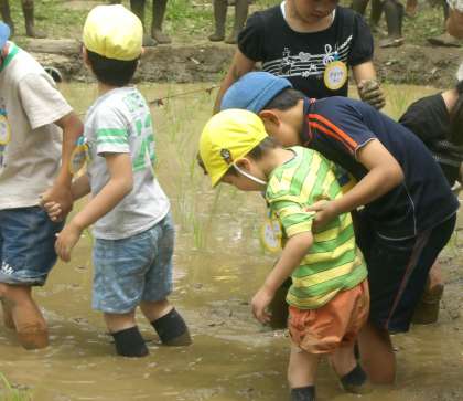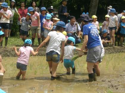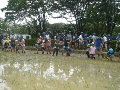 次大夫堀公園に田植えに行きました。行き帰り幼稚園の子と手をつなぎ、楽しく話をしながら歩きました。田んぼの中では、自分の足取りもままならない中、手は離さず植える場所まで行き、先に自分でやりながらやり方を教えてあげました。幼稚園の子が植えた後「そう。じょうずにできたね。」と声をかけてあげていました。どの子も温かい気持ちで接していることが伝わってきました。