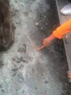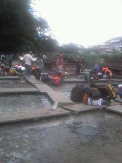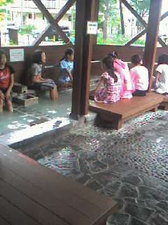 湯元源泉で10円玉をつけて綺麗にしたり、足湯で疲れをとったりしました。