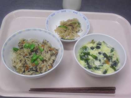五目ごはん 牛乳 とうがん入りかきたま汁 ごま酢かけ