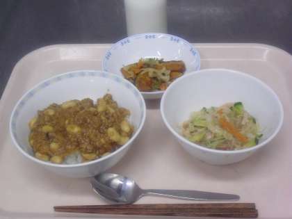麻婆大豆丼   牛乳   春雨サラダ   夏野菜チップス