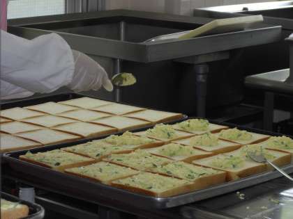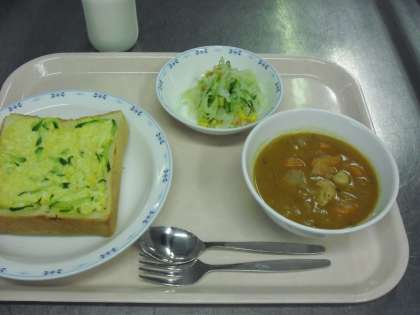 卵トースト 牛乳 ビーンズシチュー コーン入りサラダ