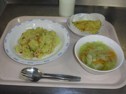 ピラフ 牛乳 ポテサラ焼き キャベツスープ