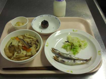 ちゃんこうどん 牛乳 焼きししゃも きぬかつぎ