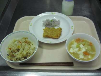 秋の混ぜごはん 牛乳 みそ汁 松風焼き