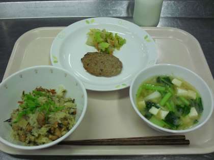 磯おこわ   牛乳   すりごまのみそ汁   さんが焼き