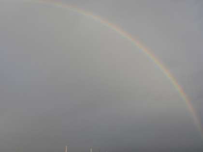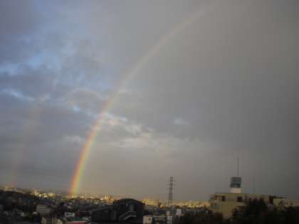 朝7:00雨上がり、日差しが雲の隙間から見えてきたころ、美しい虹を見ることができました。屋上に上がると左から右まではっきり形になっている虹が!一時は二つ見えた時間もありました。今日も、砧っ子が元気に楽しく活躍できるような、さわやかな一日のスタートでした。
