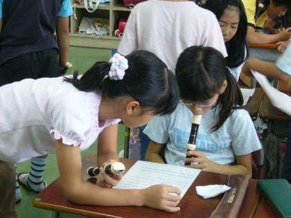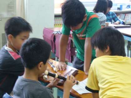 3年生が上手にふけると、4年生が嬉しそうにしていました。