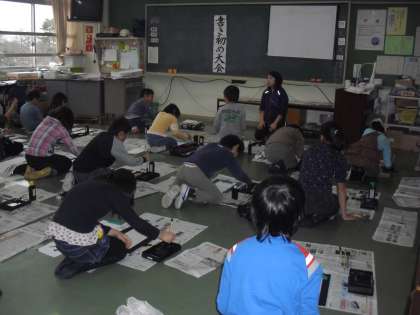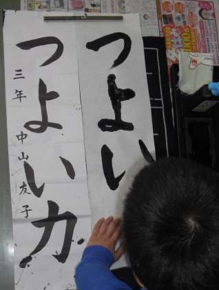 各学年、学期初めの発育測定そして書き初めが始まりました。今日は低学年の発育測定でした。発育測定前に保健指導がありました。「風邪をひかないために、うがい手洗いは大切です。手洗いは手の甲や指の間もていねいに洗いましょう。」と、歌に合わせて練習をしました。書き初めは、教室の机やいすを片付けて、床に道具を広げて書きました。姿勢を整えて、心をこめて書きました。