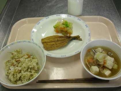豆ごはん 牛乳 魚のカレー揚げ 白菜のおかかかけ