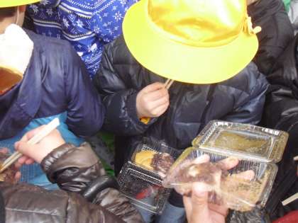 学校公開が始まりました。雪の中、たくさんの保護者・地域の皆さまにご来校いただきありがとうございます。1〜3年生は妙法寺さんの「二の午祭り」にお邪魔させていただき、お餅や甘酒をいただいたり、昔遊びを楽しんできました。「甘酒初めて飲んだ。おいしい!」「やわらかいのに、かみごたえのあるおもちでおいしい!」と大喜びの子どもたちでした。