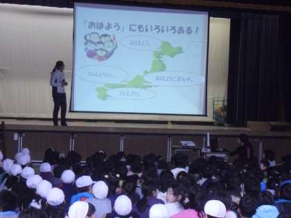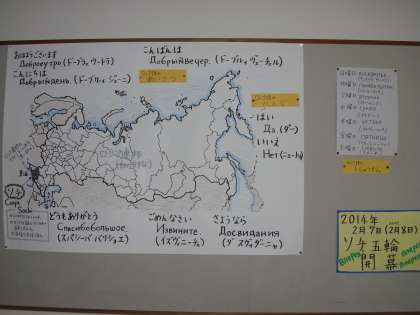 「美しい日本語を世田谷の学校から」というキャッチフレーズをご存知ですか。世田谷区の小中学生は、言語活動の基礎である「聞く、話す、書く」に重点をおき、国語や教科「日本語」をはじめ各教科の学習の中で、美しい日本語や、言葉が持つ文化的な背景を学んでいます。今日は、1時間目に日本語集会がありました。先生方の生まれ育った地方の方言を聞いたり、岩手の方言で「アメニモマケズ」を朗唱したりしました。「みどり文庫」の方にご来校いただき、今日・明日二日間にわたり、全クラスお話会をしていただきます。三階の「ことばの教室」前の掲示板には、ソチオリンピックにちなんで、ロシア語の紹介がされています。子どもたちが、言葉の大切さに気付き、言葉を通して深く考え、自分を表現して、心を通わせる喜びを知るようになってほしいと願います。