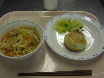おやき 牛乳 ピリ辛うどん キャベツの塩こんぶかけ