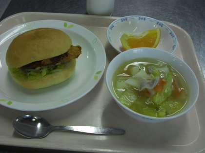 フィッシュバーガー 牛乳 ベーコンと白菜のスープ