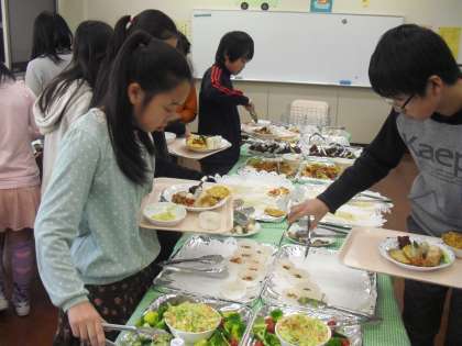 6年生の給食は、卒業をお祝いして、ランチルームで今日は1組、明日は2組のバイキング給食です。チキン、魚、おにぎり、サラダ、ビザ、フルーツ、ゼリーなどなど。調理の方が冷えたデザートを運んでくださった時「皆さんの思い出に残れば嬉しいです」とお話がありました。おいしい給食も残すところ数回です。卒業パーティーのような素敵なバイキング給食はもちろん、いちばん好きな給食はなあに?と聞くとみんなそれぞれに答えてくれる一押しメニューなど、給食の思い出は大人になっても忘れることができないことでしょう。