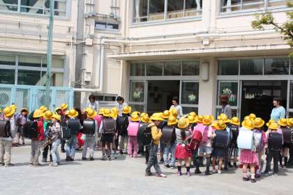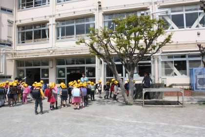 桜の花の咲きほこる中、入学式を迎えた1年生、全てが初めてのことばかりです。2日目の朝は、入学式で約束してくださった通り、PTA会長が校門の前で元気な挨拶と共に1年生の登校を待っていてくださいました。「おはようございます。」と挨拶できる子がたくさんいました。『お迎え』のない下校は、担任の先生をはじめ担任以外の先生、主事さん方がそれぞれのコースを先導しながら帰ります。交差点では、成城警察の方もいらっしゃいます。安全に気をつけて登下校して欲しいです。
