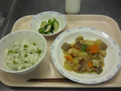 わかめ入りグリンピースごはん 牛乳 新じゃがのそぼろ煮
