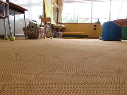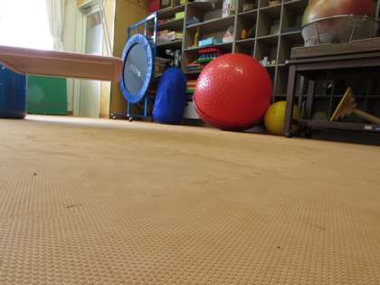 ことばの教室のプレイルームです。ここに、春休みを利用して主事さんにマットをしいていただきました(端まで「ぴっちりと」しいていただきました)。安全性が向上しただけでなく、歩き心地もよいため、好評です。