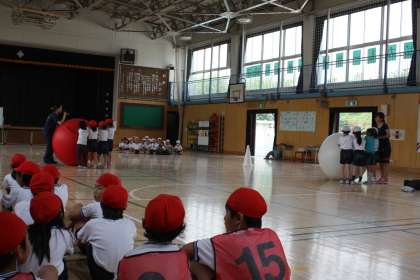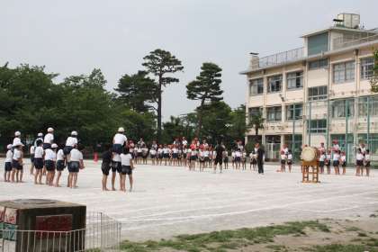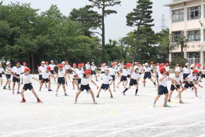 3・4年生の表現「砧ソーラン」、2年生の団体競技「力を合わせて」、5・6年生の団体競技「砧が原の合戦」の練習の様子です。暑い中、頑張っています。