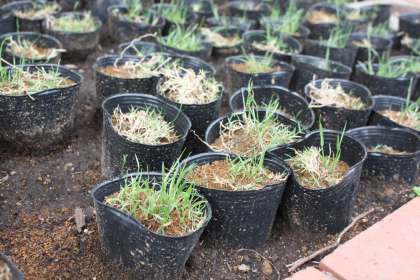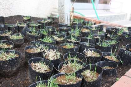 5月15日に黒いビニールポットに植えた芝生がしっかり根付き、緑の葉を伸ばし始めました。伸びてきた葉をハサミで少し切ると、さらにしっかり根を張るのだそうです。6月中旬に校庭に植え込むまで楽しみに育てていきたいです。