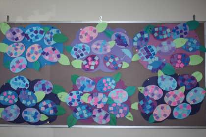 じめじめしたお天気ですが、色とりどりのアジサイが楽しめるのもこの時期ならです。校庭に、裏庭に、畑の横にいろいろな形や色のアジサイが咲いています。校内の掲示板にも満開のアジサイが飾られています。2年生が図工の時間に作ったものです。階段を上る子どもたちが、思わず足を止めてながめていました。