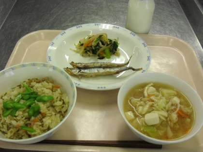 豚肉とごぼうのごはん 牛乳 みそ汁 焼きししゃも
