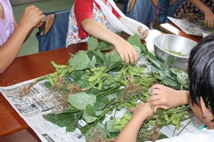 昨日の給食に枝豆が出ました。砧っ子農園で子どもたちの野菜作りについてもご指導いただいている、近隣の農家から取り寄せた枝豆でした。枝からさやをもいだのは3年生。もいだ後の枝はまた畑に戻して肥料とするそうです。旬のもの、しかも土地のものをいただくことは、お腹も心も満足になりました。