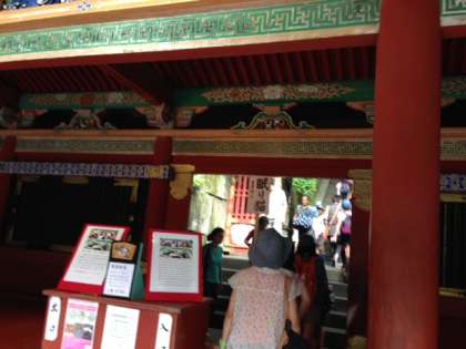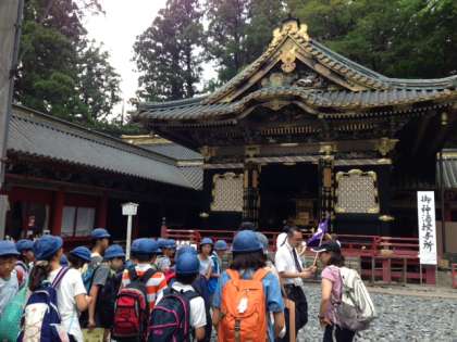 眠り猫を見たあたりから、雲行きが怪しくなり、土砂降りの雨と雷!朱塗りの廊下での風情ある雨宿り。小雨になり、鳴き竜を見学してからバスへ移動。宿舎前で開室式を始めたら、雨がポツポツ。終了して宿に入ったところで、土砂降りの雨!ラッキーなスタートとなりました。
