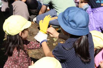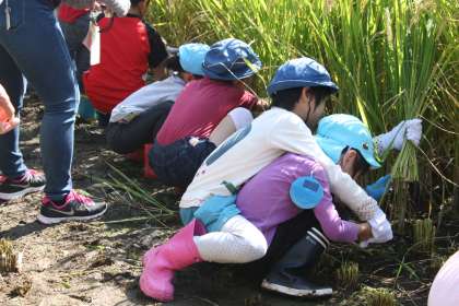 8日(水)次太夫堀公園で、5年生と砧幼稚園の年長さんが、一緒に稲刈りをしてきました。春に植えた苗が、立派な金色の稲穂に成長していました。幼稚園のお友達の鎌を持つ手に、上からそっと手を添える5年生でした。順番を待つ間も、いっしょに身支度を整えてあげたり、おしゃべりを楽しんだりする姿が見られました。