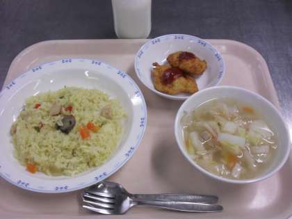 ピラフ 牛乳 ベーコンと白菜のスープ