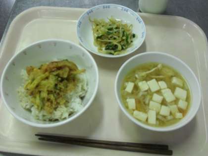 かき揚げ丼   牛乳   みそ汁   もやしのごま風味