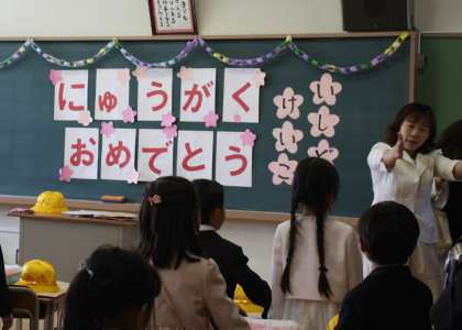 92人の1年生と、11人の転入生が砧っ子の新たな仲間となり、全校児童450名で平成27年度がスタートしました。入学式の日、満開の百年桜も砧っ子の入学・進級をお祝いしているようでした。