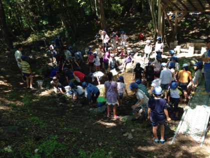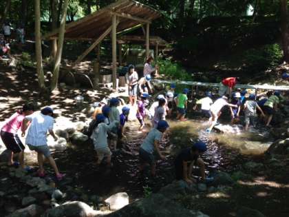冷たい川の水の中に入って、悪戦苦闘しながら、友達と協力しながら、マスつかみに挑戦しました。夕食の時に、マスの塩焼きとしていただきます。