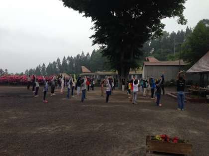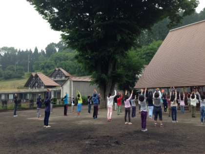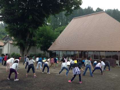 みんな、1日目と違って、ぐっすり眠むれたようですが、まだまだ眠そうです。体操で眠気を吹き飛ばしました。川場を最後まで楽しみましょうと、司会者の言葉で終わりました。