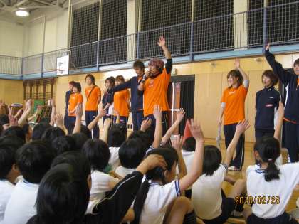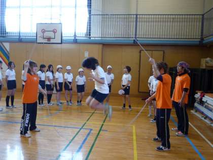 日本体育大学の方に、ダブルダッチの様々な技を見せてもらい、跳び方も教えていただきました。子どもたちはとても楽しんでいました。