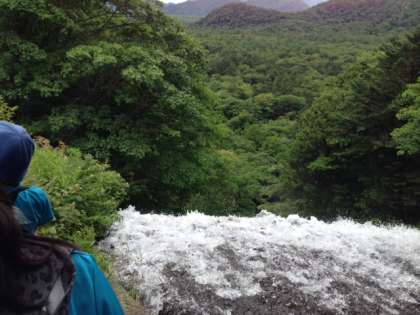 湯ノ湖から流れ落ちる湯滝。すぐ目の前で流れる滝に感動です。